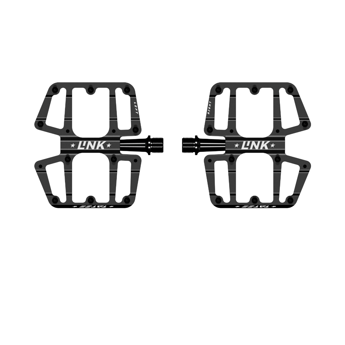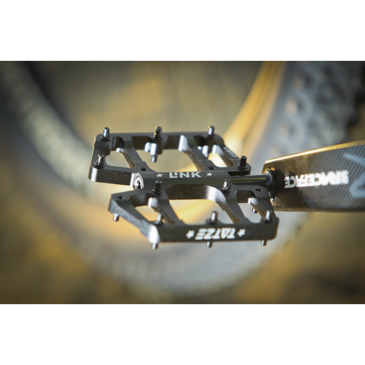 Das LINK-Pedal ist ein extrem dünnes Flat-Pedal. Die große Plattform mit 112cm2 (113x99mm/LxB) und 40 TATZE PINs mit gezielter Überhöhung sorgen für enormen Grip und eine gute Verbindung zwischen Pedal und Schuh. Um den Grip weiter zu erhöhen bzw. die Kontaktfläche zu maximieren, können zusätzlich 4 PINS pro Seite eingeschraubt werden.