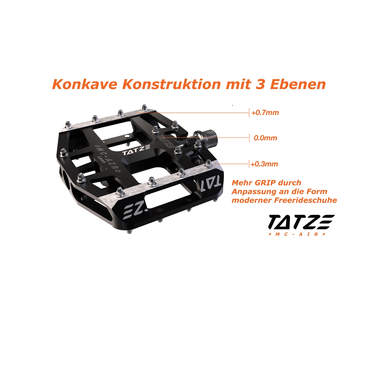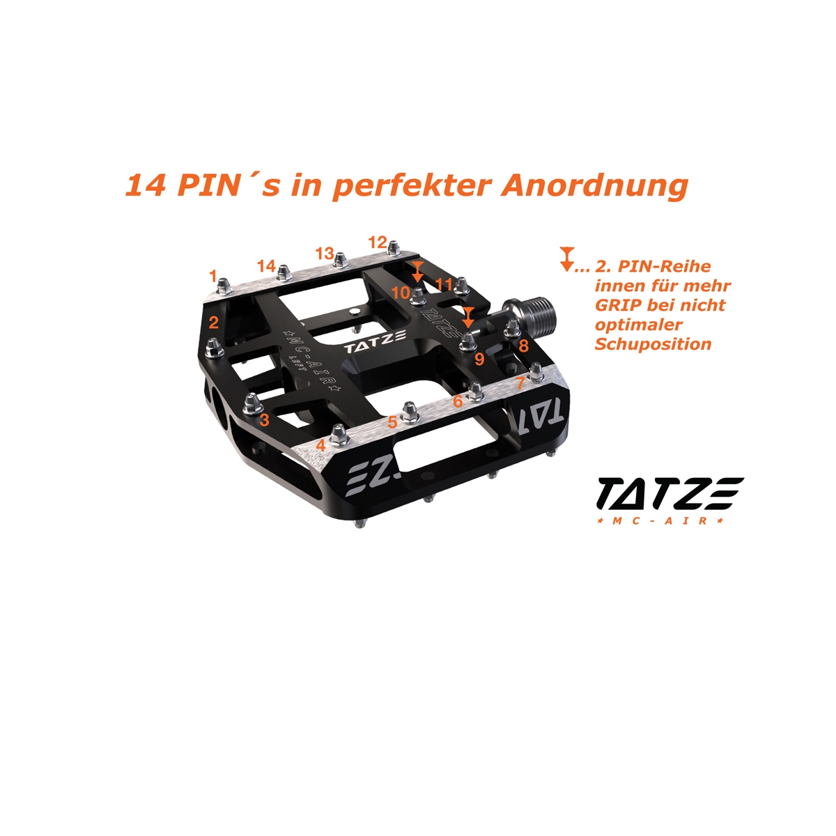 14 Pins auf jeder Seite! Das sind 40% mehr als die meisten Hersteller bei vergleichbaren Pedalen einsetzen. Das schafft das Pedal, weil es eine große Standfläche bietet und der Platz ideal für die Pins genutzt wurde. Das MC-Air ist ein Premium-Pedal mit richtig Grip und edlem Design. Das übersteht mehrere Generationen an Bikes! Und als besonderes Feature, kannst Du den Drehwiderstand selbst anpassen. Feines Teil!